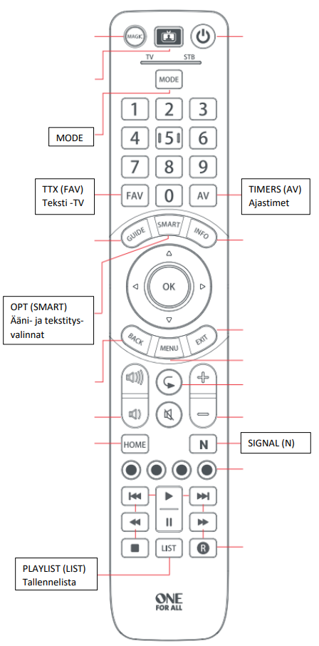 Esiohjelmoitu OneForAll kaukosäädin Finnsat FH05HDR, FH03HDR, FH10HDR ja FH1-HD digibokseille.
